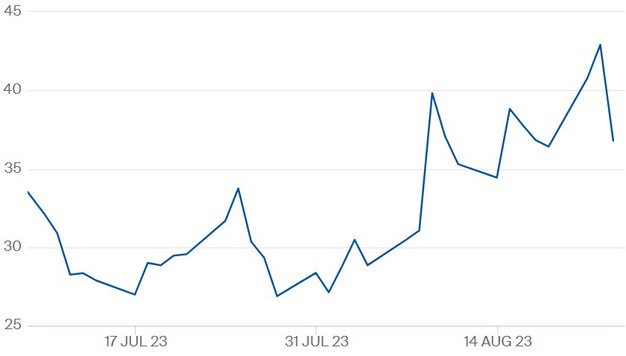 TTF-gasprijs contract 'september 2023' t/m 23 augustus 2023. Donderdagochtend daalde de prijs verder. Klik hier voor vergroting en de meest actuele cijfers.