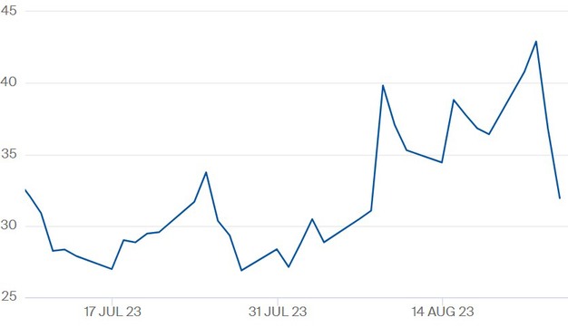 TTF-gasprijs contract 'september 2023' t/m 24 augustus 2023. Klik hier voor vergroting en de meest actuele cijfers.