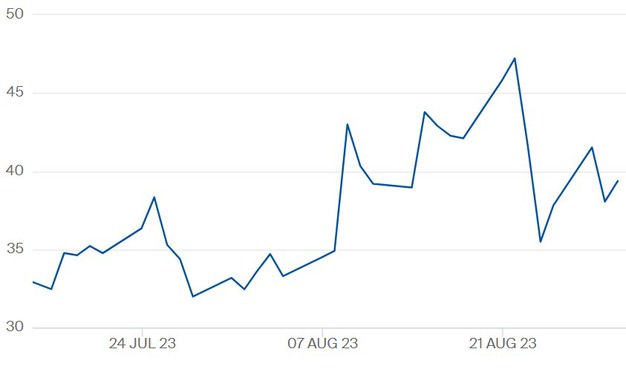 TTF-gasprijs contract juli 2023 t/m 30 augustus 2023. Klik hier voor vergroting en de meest actuele cijfers.