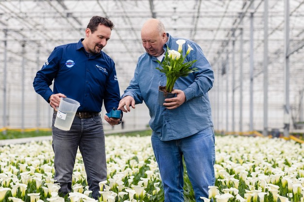 Jaap van der Meer teelt al meer dan 25 jaar Zantedeschia’s en doet dat nu als teeltmanager voor Vreugdenhil Bulbs & Plants, onderdeel van Decorum. “In die 25 jaar heb ik best wel wat voorbij zien komen: uitval, knollen die toch niet helemaal goed zijn en ziektekiemen doorgeven in de teelt. Ook nu hebben we nog weleens te maken met problemen, maar dan hebben we het vrijwel direct onder controle,” vertelt Jaap. “Zantedeschia’s zijn gevoelige soorten, daar staan ze om bekend. Maar sinds we gebruik maken van Sure Flow van CH2O is onze teelt nog nooit zo stabiel geweest.”