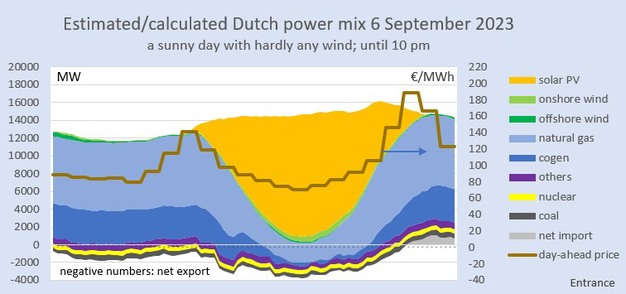 Zo zag de energiemix van gisteren eruit: overdag komt de energie goeddeels van de zon, 's nachts veel (of zelfs bijna exclusief) van fossiele brandstoffen. Grafiek gedeeld door energie-expert Martien Visser (X, voorheenTwitter)