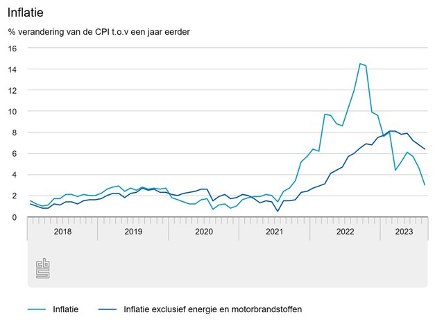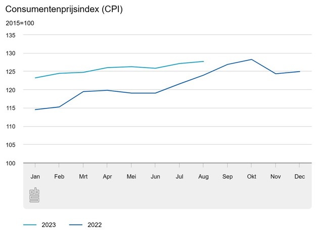 Consumentengoederen en -diensten waren in augustus 3,0 procent duurder dan in dezelfde maand een jaar eerder, meldt het CBS. In juli was de inflatie 4,6 procent. De inflatie wordt elke maand gemeten als de ontwikkeling van de consumentenprijsindex (CPI) ten opzichte van dezelfde maand in het voorgaande jaar. De daling van de inflatie wil niet zeggen dat de prijzen zijn gedaald ten opzichte van juli. De prijzen stegen in augustus ten opzichte van juli met 0,4 procent.