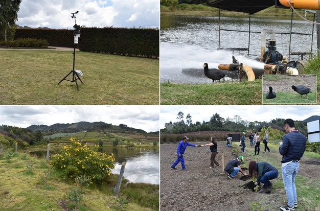 Met de klok mee: Weerstation; Tingua, een ernstig bedreigde diersoort die geniet van het frisse gerecyclede water bij Rosamin; er worden nieuwe inheemse soorten geplant omdat 15% van het teeltbedrijf moet bestaan uit inheemse planten voor het Rainforest Alliance certificaat, zoals de Alcaparro (linksonder).