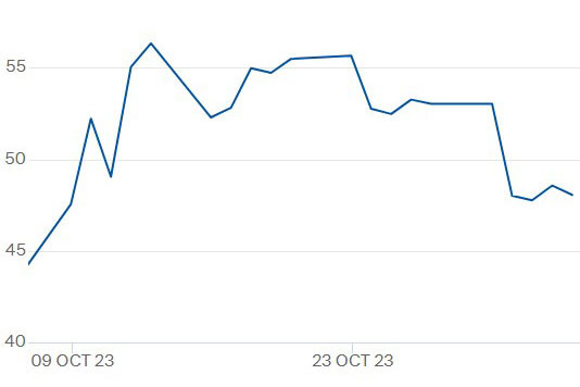 De gasprijs ligt de laatste dagen onder de 50 euro per megawattuur. Maandagochtend opende de markt voor het decembercontract op 46,6 euro. Dat is weer een stukje lager dan de 48 euro waarop de markt vrijdag afsloot. Maandagochtend liggen de contractprijzen voor heel 2024 onder de 50 euro.