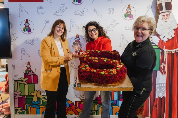 Esther Blom (Voorburg) zamelt met Sintvoorieder1 Sinterklaas- en kerstcadeautjes in voor meer dan 30.000 kinderen die leven in armoede. Esther ontving een grote letter S, opgestoken met kleurrijke chrysanten, en daarnaast nog 72 pakjes vol chrysanten om uit te delen aan overige vrijwilligers.