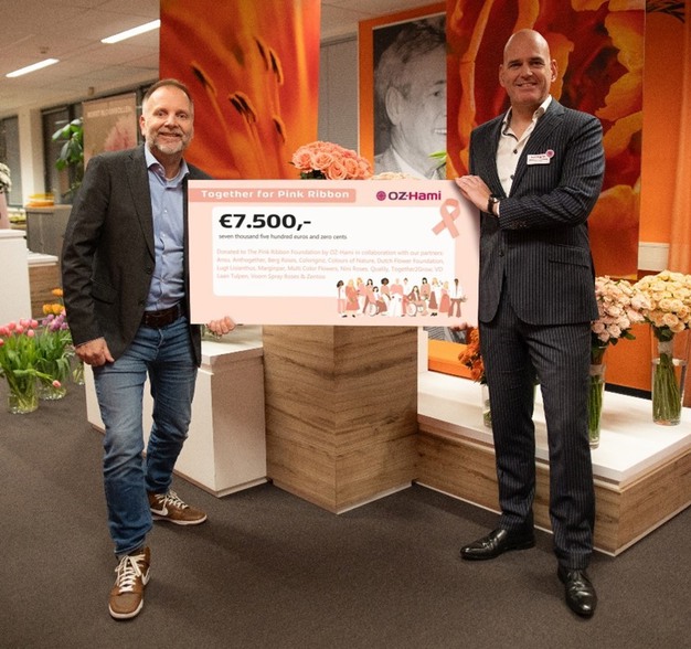 Met de verkoop van een speciale selectie bloemen hebben bloemenexporteur OZ-Hami en diverse kwekers, met steun van Dutch Flower Foundation en Coloriginz, een bedrag opgehaald van €7.500,- voor Pink Ribbon, een nationale organisatie die zich inzet voor de strijd tegen borstkanker.