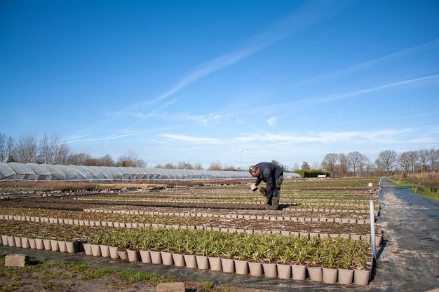 Kwekerij Verhoeven in het voorjaar. De planten staan buiten op een open veld. Foto: Sprinklr
