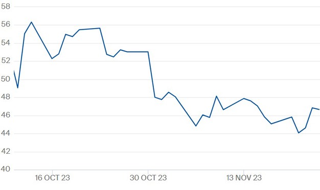 Met een gasprijs van 46,1 euro voor het decembercontract opent de TTF-markt week 48. Grote prijsschommelingen bleven afgelopen week uit. Deze week wordt het gevoeliger kouder, er kan sneeuw vallen en de eerste nachtvorst was daar, maar met volle gasopslagen zou dat geen reden voor paniek mogen zijn.