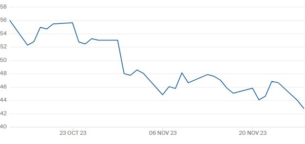 TTF-gasprijs contract 'december 2023' t/m 28 november 2023. Klik hier voor vergroting en de meest actuele cijfers.