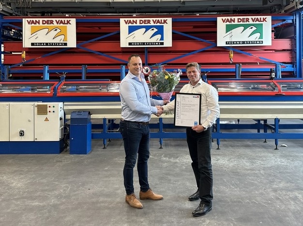 Als 27ste bedrijf is Van der Valk Horti Systems aangesloten bij de AVAG-leden met HortiQ-certificering. Het bedrijf in Monster, onderdeel van Van der Valk Systemen, ontving het BRL-8001-certificaat voor het algemene kwaliteitsbeleid uit handen van HortiQ-voorzitter Hans van der Salm. ‘We kregen steeds vaker de vraag van klanten om aan te tonen dat we alles goed hebben georganiseerd’, zegt commercieel manager Rob Bekkering over de stap. Het certificaat is meteen een extra bekroning voor het 60-jarig bestaan van het bedrijf, dat wereldwijd scherminstallaties en luchtmechaniek levert.