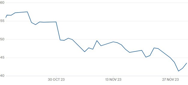De gasprijs was geruime tijd aan het zakken, maar tot onder de 40 euro zakken is niet gelukt. Sinds afgelopen donderdag stijgt de TTF-gasprijs weer. Vrijdag sloot de prijs voor het januaricontract op net geen 43,50 euro af. Maandagochtend opende de markt op 42 euro.
