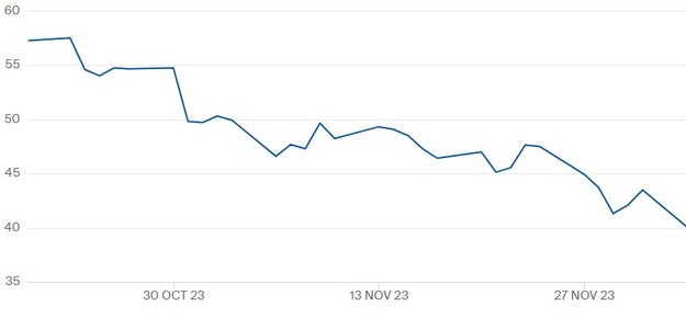 TTF-gasprijs contract 'januari 2024' t/m 4 december 2023. Klik hier voor vergroting en de meest actuele cijfers.