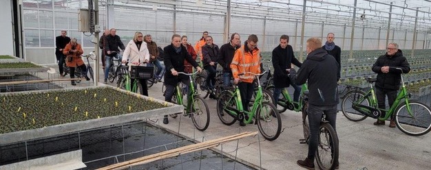 Op de fiets door de kassen van Kwekerij Gitzels vertelde Mike Gitzels over de verduurzamingsstappen die het bedrijf inmiddels heeft genomen en wat er nodig is voor de volgende stappen. Een belangrijk onderdeel wordt betaalbare groene elektriciteit in de winter. Via de Nieuwe Dijk volgde de fietstocht naar de buren: Fred van Paassen Chrysanten, waar Jan van Paassen op enthousiaste wijze de raadsleden vertelde over de chrysantenteelt met Led-verlichting, luchtontvochtiging en biologische bestrijding. Jacco Vooijs: "Het was een zeer boeiend werkbezoek waarbij de interesse voor de stappen die de glastuinbouw in Het Grootslag gemaakt heeft zeer groot was, dat bleek uit de vele verdiepende vragen van de raadsleden."