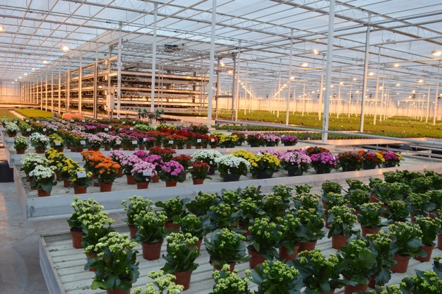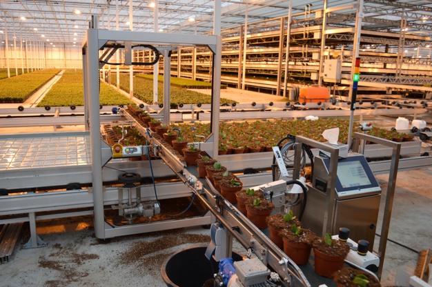 De kas is tevens een 'showkas'. Op de achtergrond zijn tafels op een aantal lagen te zien. Dat kan omdat de eerste paar dagen na het oppotten de planten niet veel licht nodig hebben
