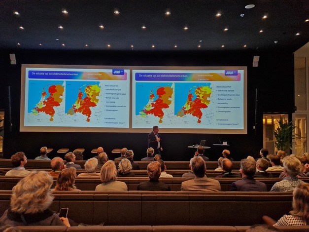 Iets meer de diepte in ging het vervolgens in de presentatie van Frank Binnekamp, CEO van elektriciteitsbedrijf Juva. Staand voor een filekaart die steeds meer rood kleurt ging het over netcongestie en hoe dat opgelost moet worden.
