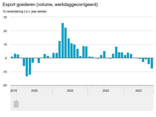 Het volume (werkdaggecorrigeerd) van de goederenexport was in oktober 7,5 procent kleiner dan in oktober 2022, meldt het CBS. Vooral de uitvoer van voedings- en genotmiddelen, aardolieproducten en aardgas is gekrompen ten opzichte van een jaar eerder. Het volume van de goederenimport was in oktober 8,7 procent kleiner dan in oktober 2022. Volgens de CBS Exportradar waren de omstandigheden voor de export in december ongunstiger dan in oktober.