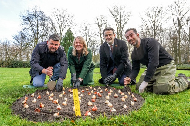 Ter gelegenheid van het feestelijk jaar 2024 heeft de Turkse ambassadeur Selçuk Ünal samen met Keukenhof-directeur Sandra Bechtholt en Pekflex-groenbeheer Hassan Peckan en Taner Koca de laatste bloembollen in Keukenhof geplant.
