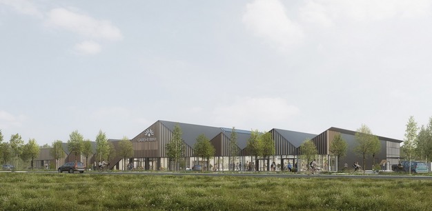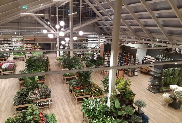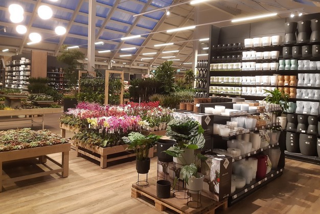 Het asymmetrische dak geeft allure aan het vooraanzicht van het nieuwe tuincentrum. De grote ramen aan de voorkant zorgen voor de verbinding tussen buiten en binnen en bieden de mogelijkheid om veel producten uit te stallen. Verder zorgen de natuurlijke zonwering van de verticale houten jaloezieën en het groene dak voor de biofiele uitstraling die bij het bedrijf past. Een overdekte gang rond het buitenterrein zorgt ervoor dat klanten ook bij slecht weer comfortabel kunnen winkelen.