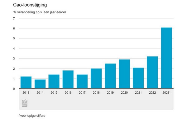 In 2023 lagen de cao-lonen gemiddeld 6,1 procent hoger dan in 2022. Deze toename is bijna een verdubbeling van de ontwikkeling van het jaar ervoor, toen de lonen nog met 3,2 procent stegen. Deze cao-loonstijging is de grootste in ruim veertig jaar tijd. Dit meldt het CBS op basis van nieuwe cijfers.