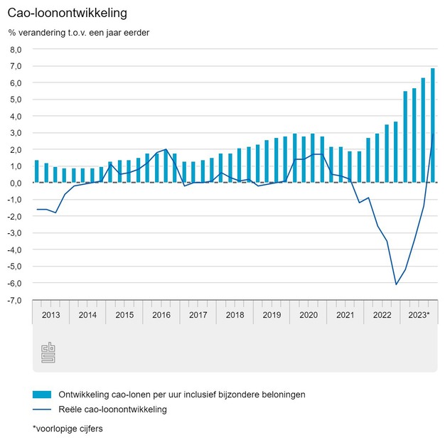 In het laatste kwartaal van 2023 lagen de cao-lonen 6,9 procent hoger dan in hetzelfde kwartaal een jaar eerder. Al twee jaar achtereen is de cao-loonstijging elk kwartaal groter.