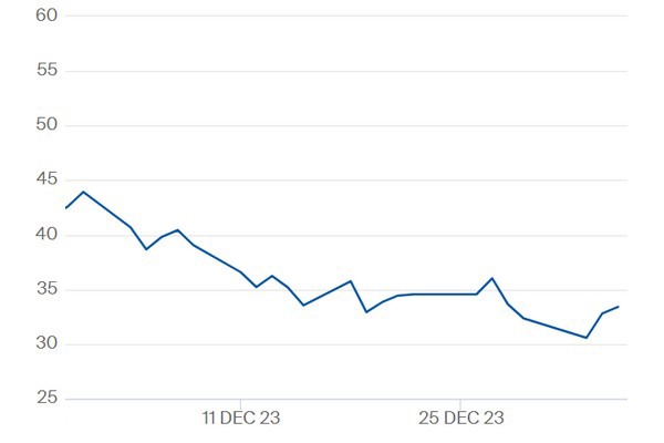 TTF-gasprijs, maandcontract februari 2024, t/m 4 januari 2024. Klik hier voor de gasactualiteit bij de TTF.