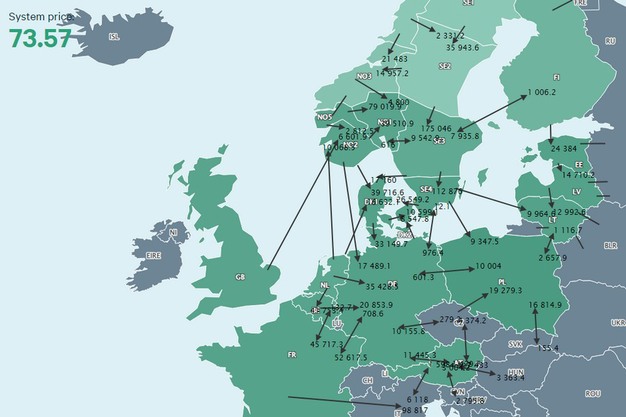 Grafische weergave 'day ahead flows' 9 januari. Het toont de verbondenheid van Europa op elektriciteitsgebied. De grafische weergave is van Nord Pool Group.