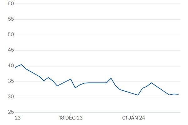 TTF-gasprijs contract februari 2024 t/m 11 januari. Klik hier voor vergroting.