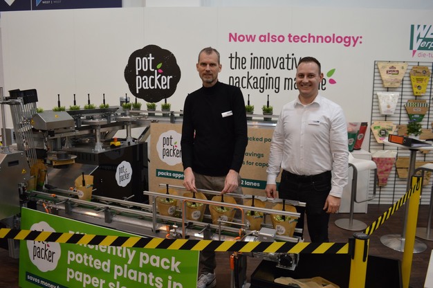 Olaf Amende en Timo Kauke van Weber Verpackungen tonen de onlangs gelanceerde Pot Packer, een machine waarmee potplanten automatisch in een papieren hoes kunnen worden gestoken