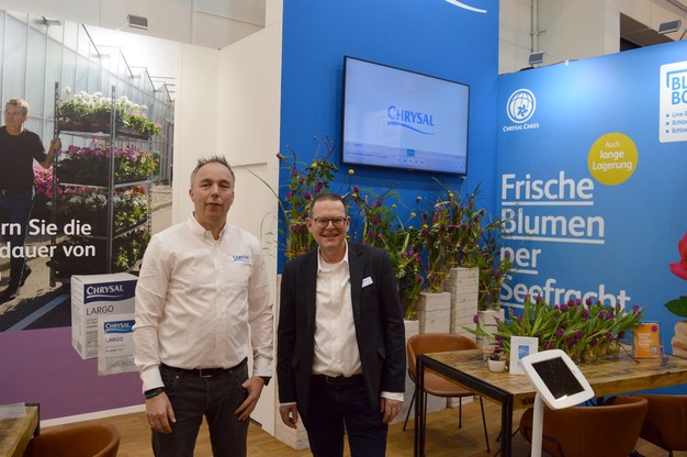 Tjerk v/d Schaf en Ale Toering van Chrysal, dat dit jaar stilstaat bij het 75-jarig jubileum van de bloemvoeding
