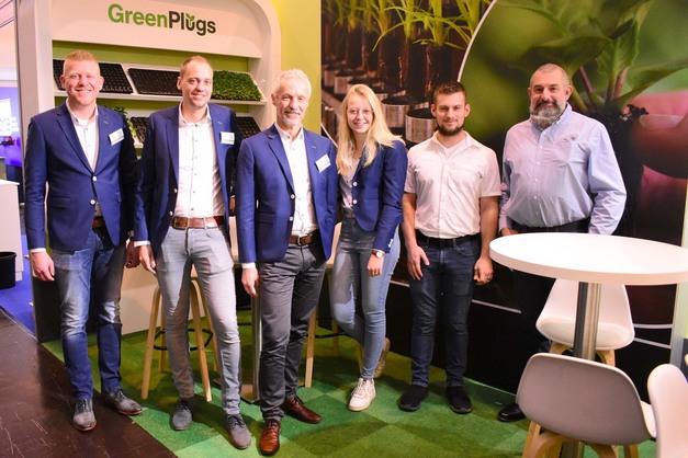 Jan, Matthijs, Onno, Anna, Will en Simon. Will en Simon zijn van Green PLugs North America en kwamen voor de internationale connecties uit Amerika en Noord-Amerika op de beurs.