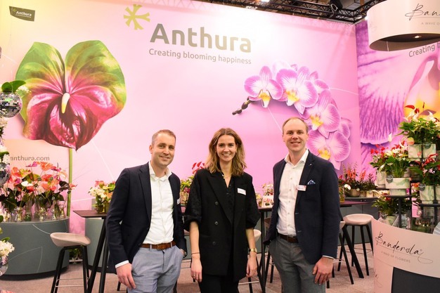 Jos, Laura en Gert van Anthura presenteren op de beurs o.a. de re-branding met de nieuwe slogan "Creating Blooming Happiness" in combinatie met het nieuwe logo.