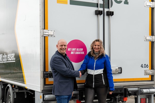 Zorgvuldig plakten Bas Euser, directeur/eigenaar van Koninklijke Euser en Elisabeth Post, bestuursvoorzitter van TLN een enorme roze sticker op de achterkant van één van de 500 vrachtauto’s van het transportbedrijf. Het is de bedoeling dat straks door heel Nederland vrachtauto’s en busjes rondrijden met zo’n sticker met de tekst ‘Het lukt alleen met logistiek!’ Als onderdeel van de gelijknamige imagocampagne. ‘Goed en belangrijk dat die gevoerd wordt’, vindt Euser.