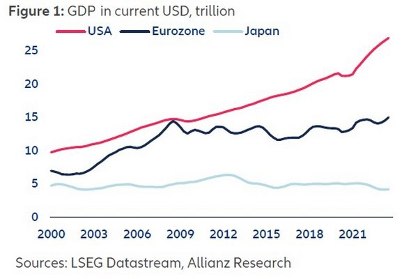 De kloof tussen de VS en de EU is in 25 jaar verdrievoudigd. Bij de invoering van de euro was de Amerikaanse economie 11% groter. Dat verschil is uitgegroeid tot 30%. Op een breed front raakt Europa steeds verder achterop, zo blijkt uit het rapport 'Europe needs to step up its game' van kredietverzekeraar Allianz Trade.