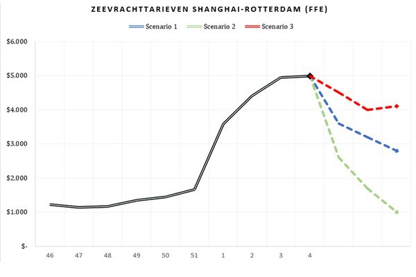 In zo'n geval keert de situatie van begin december met relatief lage vrachttarieven in rap tempo terug. Rederijen zullen dan een tariefdaling proberen tegen te houden via intensere annuleringen van afvaarten, port calls en andere vormen van capaciteitsreductie.