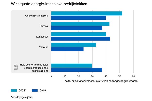 Het CBS komt met cijfers over hoe energie-intensieve bedrijven in hun portemonnee geraakt zijn door de hoge energieprijzen. Op de landbouwsector na nam ondanks de hogere prijzen de winstquote van drie op de vier energie-intensieve bedrijven toe ten opzichte van 2019. Het gaat hierbij om de chemische industrie, de horeca en de vervoerssector.