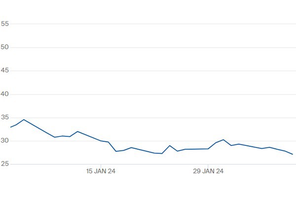 TTF-gasprijs contract maart 2024 t/m 9 februari. Klik hier voor vergroting.