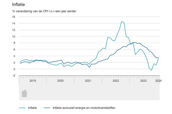 Consumentengoederen en -diensten waren in januari 3,2 procent duurder dan in dezelfde maand een jaar eerder, meldt het CBS. In december was de inflatie 1,2 procent. De inflatie wordt elke maand gemeten als de ontwikkeling van de consumentenprijsindex (CPI) ten opzichte van dezelfde maand in het voorgaande jaar. Het inflatiecijfer van januari is hetzelfde als bij de snelle raming die op 1 februari is gepubliceerd.