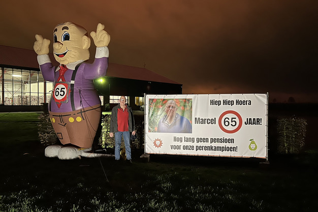 Vandaag is Marcel Leeuwis 65 jaar geworden. "Nog iedere dag gaat hij ’s avonds als laatste weg en is hij ’s ochtends voor 6 uur weer op het bedrijf. Hierdoor moesten wij vroeg zijn om alles op tijd klaar te hebben staan zonder dat hij het in de gaten had. Zoals het spandoek al aangeeft denkt hij nog niet aan stoppen en gaat hij graag nog een tijdje door", vertellen zijn collega's.