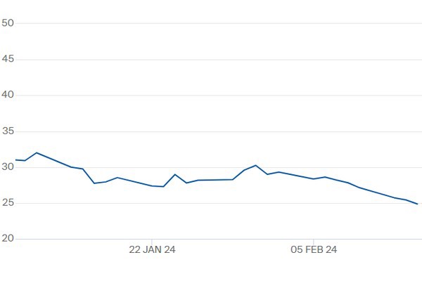 TTF-gasprijs contract maart 2024 t/m 14 februari. Klik hier voor vergroting.