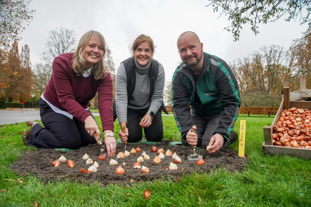Dit najaar heeft H.E. Joanna Roper, ambassadeur van het Verenigd Koninkrijk in Nederland, samen met Keukenhof-directeur Sandra Bechtholt en tuinman Patrick van Dijk de tulipa King Charles lll geplant. In het voorjaar komt deze goudgele tulp tot bloei.