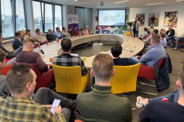 Meer dan 40 enthousiaste leden van de Horti Inspiration Group namen deel aan de bijeenkomst waarin Marcel Zandvliet, CMO/CSO bij Dutch Flower Group (DFG), aan de hand van DFG's strategie in gesprek ging met de deelnemers.