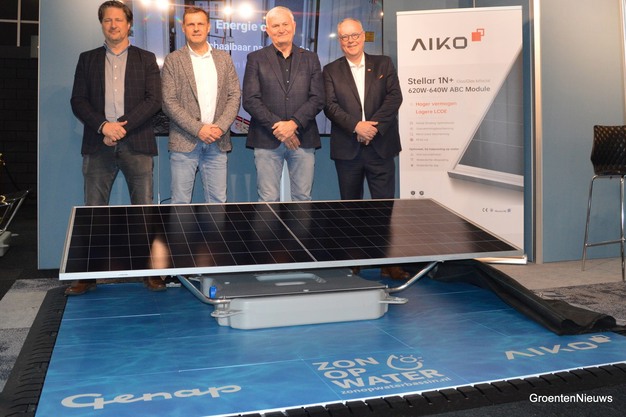Tholen - Met een nieuw zonnepaneel met speciale eigenschappen kunnen telers dit jaar nog meer uit hun zonnepaneleninstallatie op een waterbassin halen. Dinsdag is op de HortiContact hiervoor een samenwerking officieel bekrachtigd. Aiko sluit als leverancier van speciale zonnepanelen aan bij Zon op Waterbassin, waarin Aquasol Solar en Genap al samenwerken.