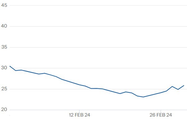 De gasprijs is vorige week stiekem weer tot boven de 25 euro per megawattuur uitgeklommen. Het leverde koppen op als 'gasprijs stijgt met ruim tien procent'. Bij de start van een nieuwe week ligt de TTF-daggasprijs maandagochtend weer dicht bij die 25-eurogrens.