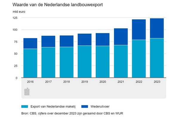 De Nederlandse economie heeft in 2023 naar schatting 50,4 miljard euro verdiend aan de export van landbouwgoederen (4 procent hoger dan in 2022), waarvan 45,7 miljard euro dankzij de export van Nederlandse makelij en 4,7 miljard euro dankzij de wederuitvoer van landbouwgoederen die in het buitenland geproduceerd zijn.