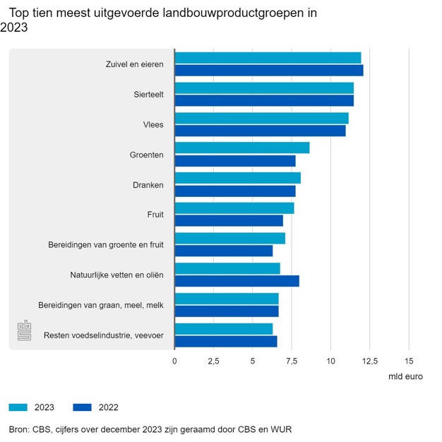 In de ranglijst van meest uitgevoerde landbouwproducten is de top drie ten opzichte van 2022 ongewijzigd gebleven met de export van zuivel en eieren op één, de sierteeltexport op twee en de vleesexport op drie. De exportwaarde van zuivel en eieren (12,0 miljard euro) en van sierteelt (11,5 miljard euro) bleef tussen 2022 en 2023 nagenoeg onveranderd. Verderop in de lijst is de export van groenten (met 12 procent), van fruit (met 11 procent) en van bereidingen van groente en fruit (met 14 procent) sterk in waarde gestegen.