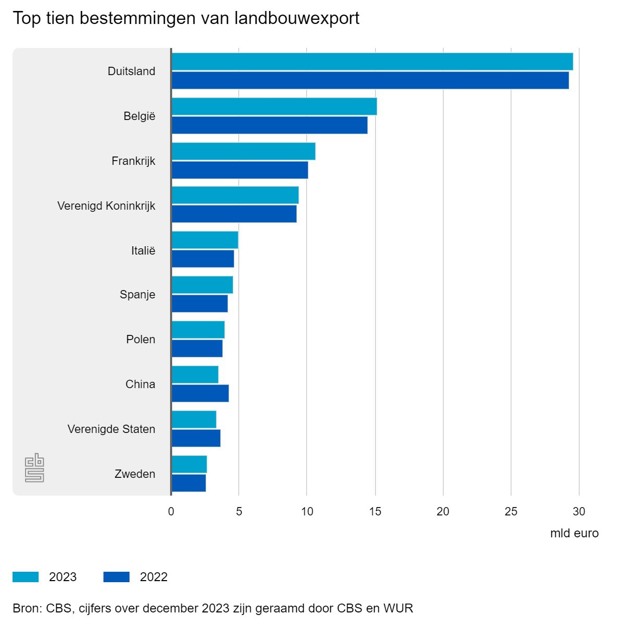 Traditiegetrouw is Duitsland de belangrijkste afnemer van landbouwgoederen uit Nederland. Ook dit jaar gaat het om bijna een kwart van de totale Nederlandse landbouwexport (29,6 miljard euro in 2023). De procentuele groei van deze exportstroom was wel kleiner (+1 procent) in 2023 dan bij de export naar België (+5 procent) en Frankrijk (+6 procent). De export naar het Verenigd Koninkrijk is met 0,5 procent toegenomen in 2023.