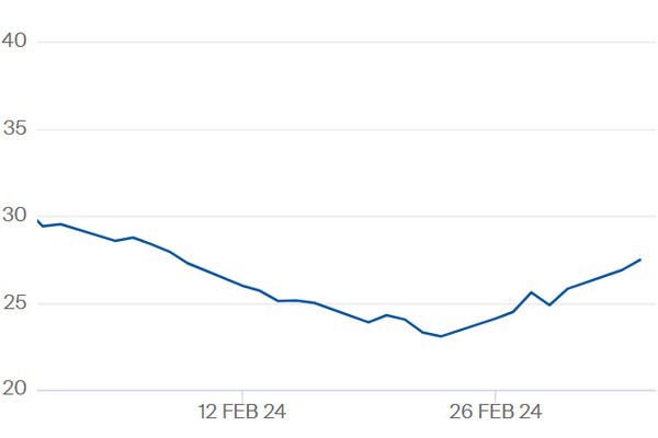 In het geval van TTF-gas is de prijs van het dichtstbijzijnde maandcontract (inmiddels april 2024) ten opzichte van het prijsdal van net aan 23 euro op 23 februari met 19% gestegen. De prijs voor kwartaal 4 van 2024 ligt vanwege de recente prijsstijging weer boven de 30 euro en datzelfde geldt voor de prijzen voor contracten voor het laatste kwartaal van 2025.