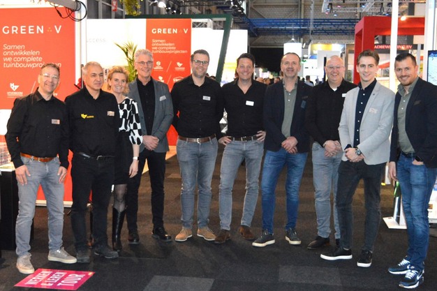 GreenV stond met diverse stands vlakbij elkaar. Het was bijna een GreenV-plein. De mannen werden vlug even verzameld door Mirjan voor deze foto. HT Verboom, Green Simplicity, Stolze, Voshol, Prins Group, Prins USA, JV Energy, Apex en GreenV Mexico vallen allemaal in deze bedrijvengroep.