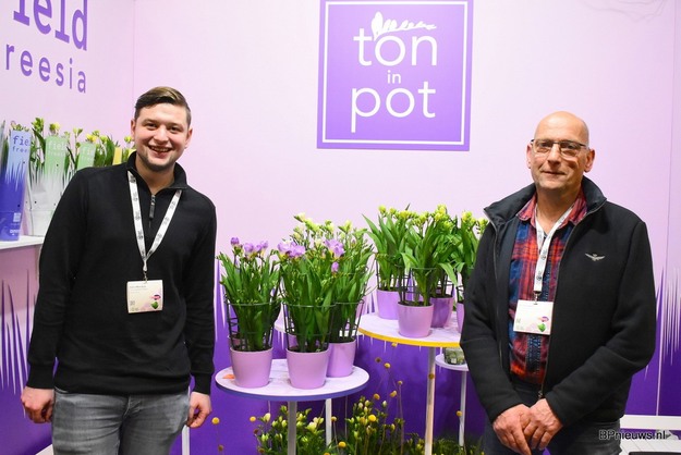 Calvin Blomjous en Ton Vreugdenhil stonden op de beurs met een "mooie compacte plant van de serie, Fielf Freesia" van Ton in Pot.