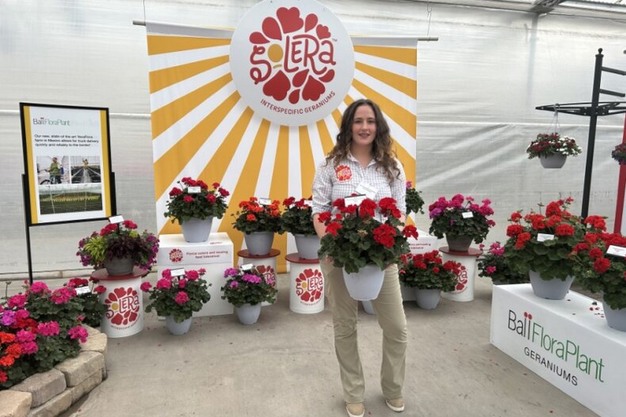 Voor 2025 lanceert Ball FloraPlant zijn eerste geraniumserie Solera. Productmanager Sarah Swofford-Hernandez presenteert hier de Solera Red, één van de vijf felle kleuren uit de range. Solera wordt geleverd vanuit Yecaflora, de nieuwe ultramoderne farm van het bedrijf in Mexico.